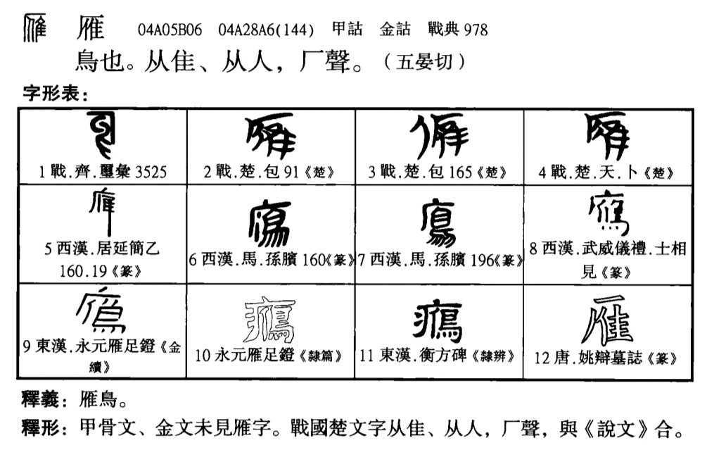 甲骨文【工隹(壬隹)】或釋鴻字。鴻雁。《詩經》鴻雁于飛,肅肅其羽。之子於徵,劬(qú)勞於野。毛傳曰:大曰鴻,小曰鴈(雁)。