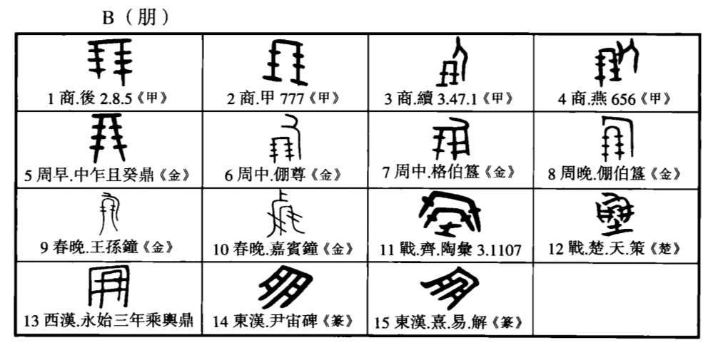 古代貨幣單位。相傳五貝為一朋。或説兩貝為一系,兩係為一朋。也有説十貝為一朋的。