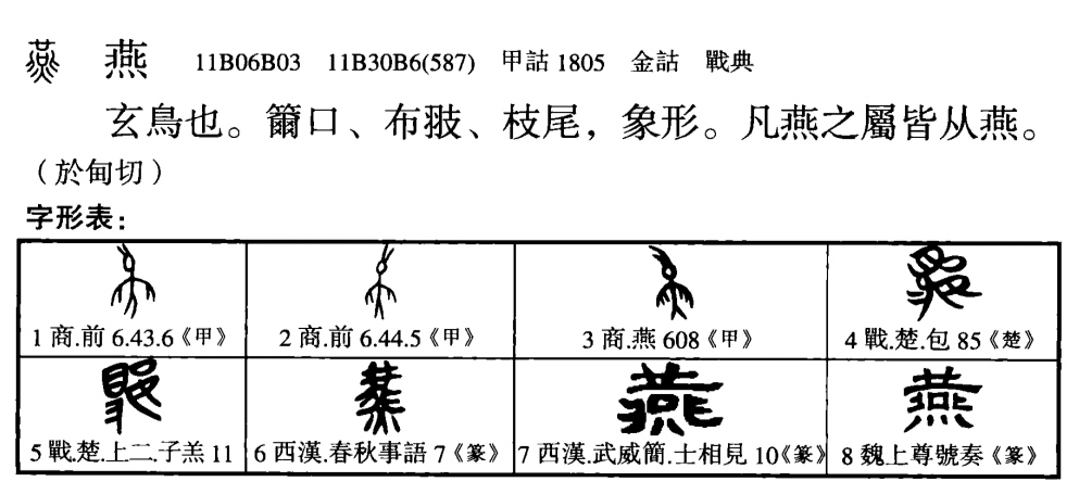 甲骨文【燕】【詩·邶風】燕燕於飛。【玉篇】俗作鷰。【集韻】亦作䴏。