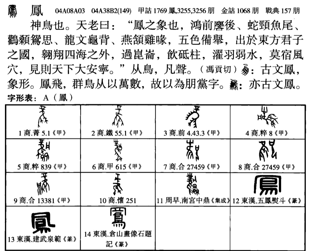 甲骨文、金文【鳳fèng(候鳥)、風(季風)、鵬、朋、飛飛】互為異體分化字。詞例:大風自北、小風、不風。《説文》朋,古文鳳。鵬,亦古文鳳。