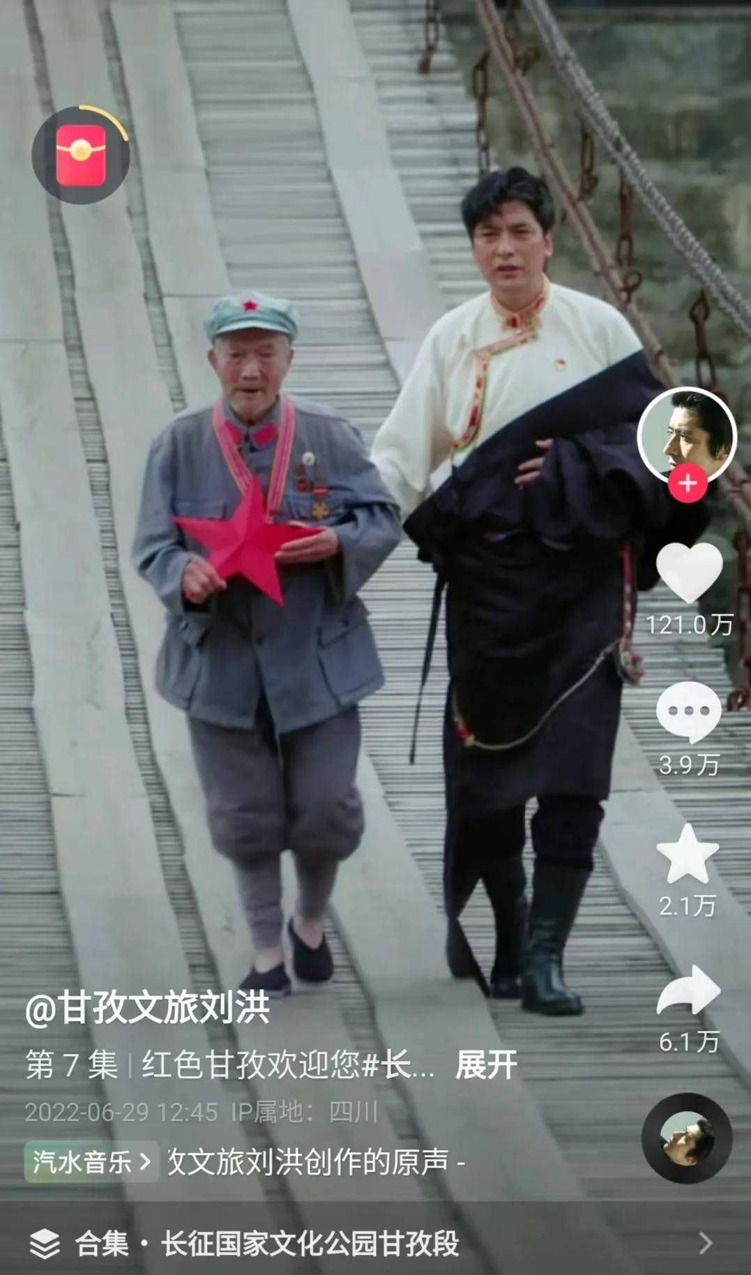在“甘孜文旅劉洪”抖音號中,劉洪以甘孜州五彩斑斕的景色為背景,通過變裝扮演着多個角色。人們能夠看到他扶着已經96歲的老紅軍,重返英雄瀘定橋,也能看到他在甘孜州的雪山荒漠裏扮演者古龍、金庸書中的大俠。