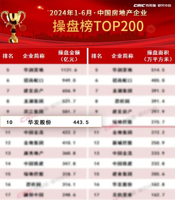 上半年,華髮股份以銷售去化為核心,不僅在市場競爭中穩固了自身的領先地位,還通過一系列創新舉措和市場深耕,實現了市場地位的顯著提升。半年報顯示,華髮股份上半年實現銷售額452億元,位列克而瑞銷售榜單第11位,相比2023年同期上升3位。而在克而瑞操盤榜上,華髮股份以上半年443.5億元的操盤金額,躋身行業TOP10,進入行業第一梯隊。