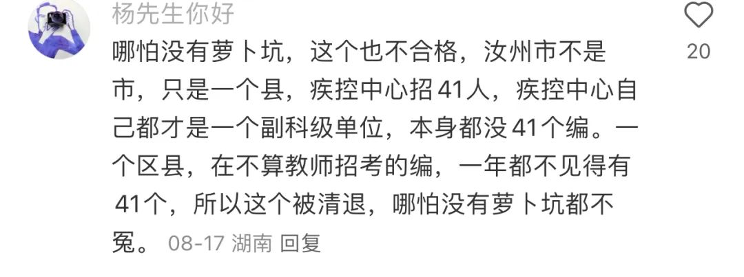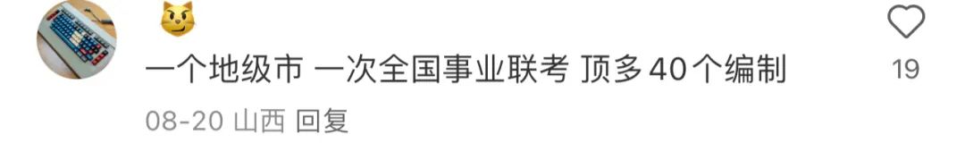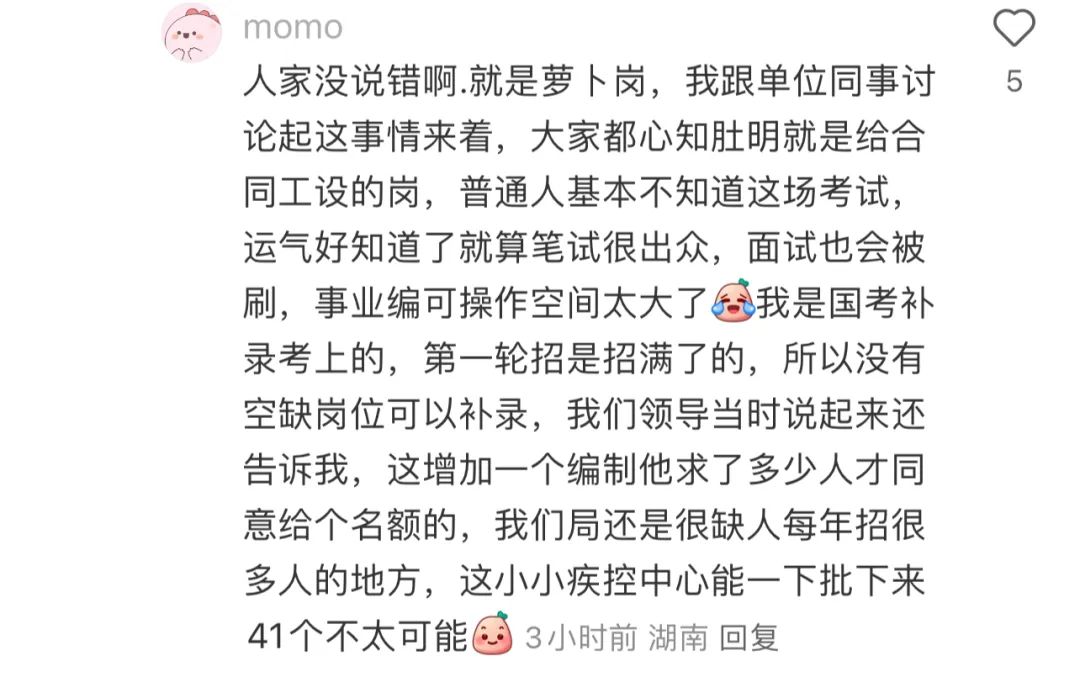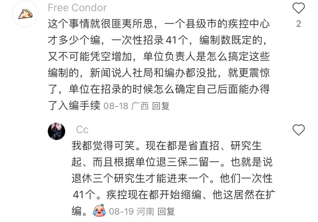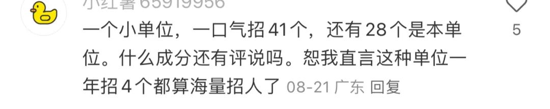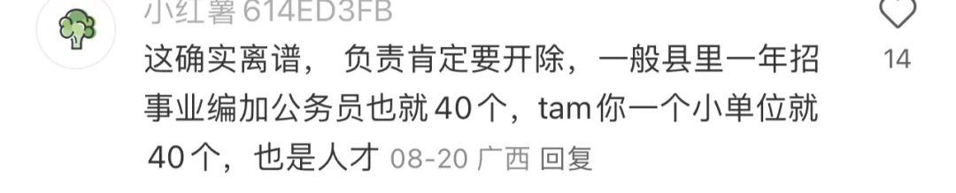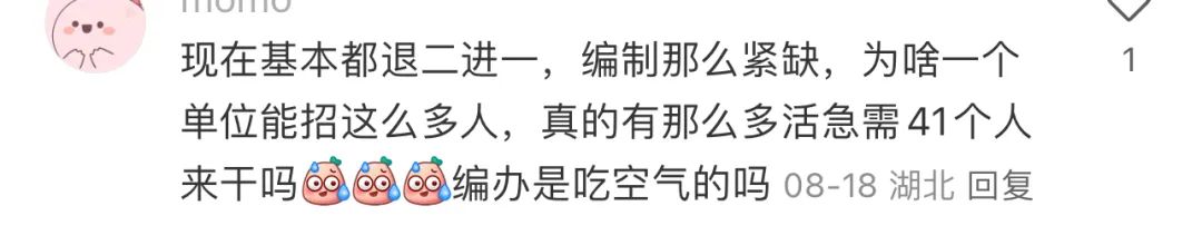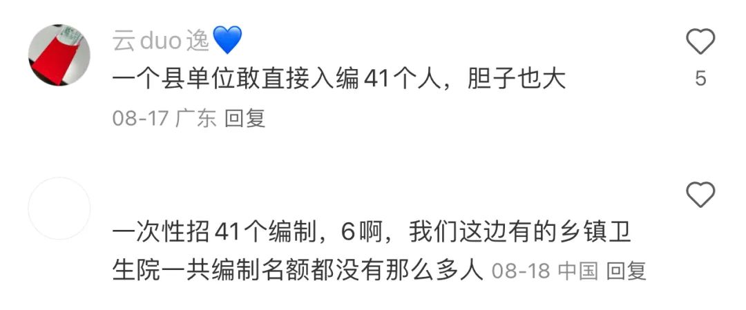 有了解編制的網友説,一個地級市的一次聯考才給40個編,所以一個縣級市的一個單位一次招聘就給了41個編這件事就更顯得離譜到家……