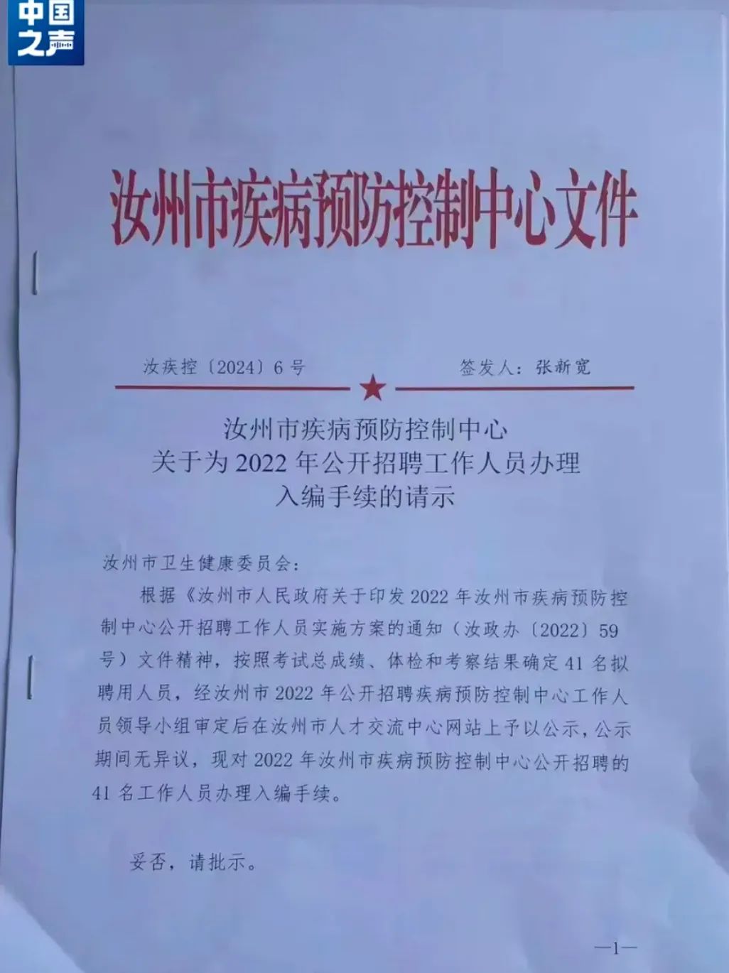 經報名、資格審查、筆面試、體檢政審等層層考核,於2024年2月1日對擬聘用的41人進行公示(13名社會考生+28名汝州疾控原非在編職工考生)
