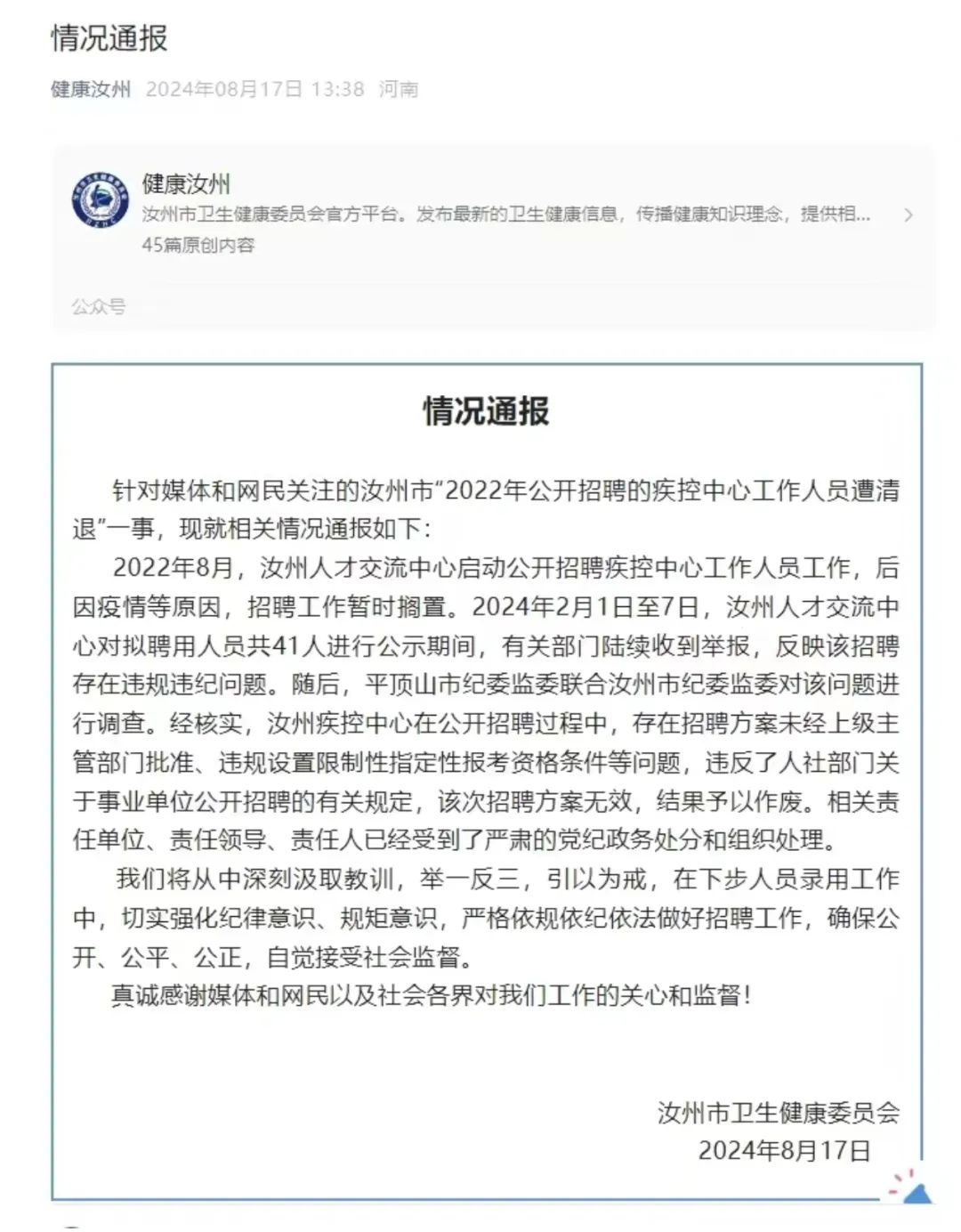 河南汝州41人考上事業編被清退?網友撤回同情:如果是蘿蔔崗的話不冤_風聞