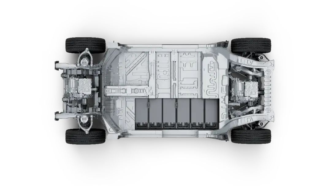 而之所以叫作 “ 滑板 ” ,不是因為它嘎嘎能滑,主要是它把電池包、電驅和前後橋都給整合起來了,看起來就是兩邊高中間低,賊像一塊滑板。