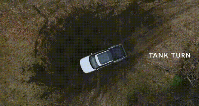 在駕駛上,線控系統還能解鎖更多的玩法,就像同樣用上滑板底盤的 Rivian ,搭載了四輪轉向和輪轂電機,可以輕輕鬆鬆玩 “ 坦克掉頭 ” 。