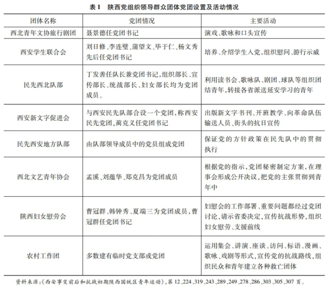 1937年7月15日,中共中央要求各級黨組織積極建立救亡團體,同時指示共產黨員應成為各地救亡組織的發起者。以青年學生羣體為例,共產黨通過黨團主持學生團體的領導機關,自上而下推動組織擴展。早在1937年年初,中共陝西省委即設立西安學生工作委員會,管理西安各校黨支部及西安學生聯合會、西北文藝青年協會等團體中的黨團。該委員會的主要任務是貫徹中共陝西省委的決定、指令和工作安排;向各青年團體傳達共產黨的政策精神,保證共產黨對西安學生運動的領導;指導羣眾組織開展救亡運動。全面抗戰初期,在學生工作委員會的領導下,黨團領導下的羣眾組織數量迅速增長,活動日益增多(參見表1)。