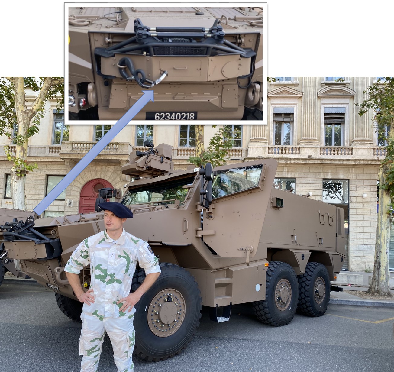 格里芬(Griffon,獅鷲)6×6 裝甲輸送車(VBMR,多用途裝甲車),是VAB的換代型號,戰鬥全重24.5噸。車上乘員包括1名駕駛員、一名炮手和8名搭載的步兵,車頂右前方設置有一座遙控武器站,安裝7.62毫米機槍(也有12.7毫米機槍的版本)以及下方一圈8枚煙幕彈發射器。相較於履帶式裝甲車,輪式車輛具有輕量化、機動迅速、便於部署的優點(當然也方便拉到市中心廣場上展覽)。