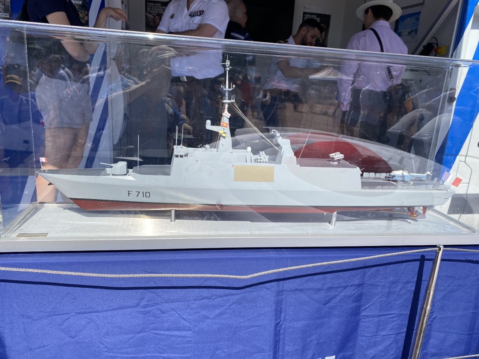 法國海軍擺了個“拉法耶特”級護衞艦首艦F710拉法耶特號的模型。這是世界上第一款採用雷達隱身外形的軍艦,1996年服役,排水量3000噸級。法軍自身裝備5艘,我國台灣地區也於上世紀90年代採購了6艘,命名為“康定級”。