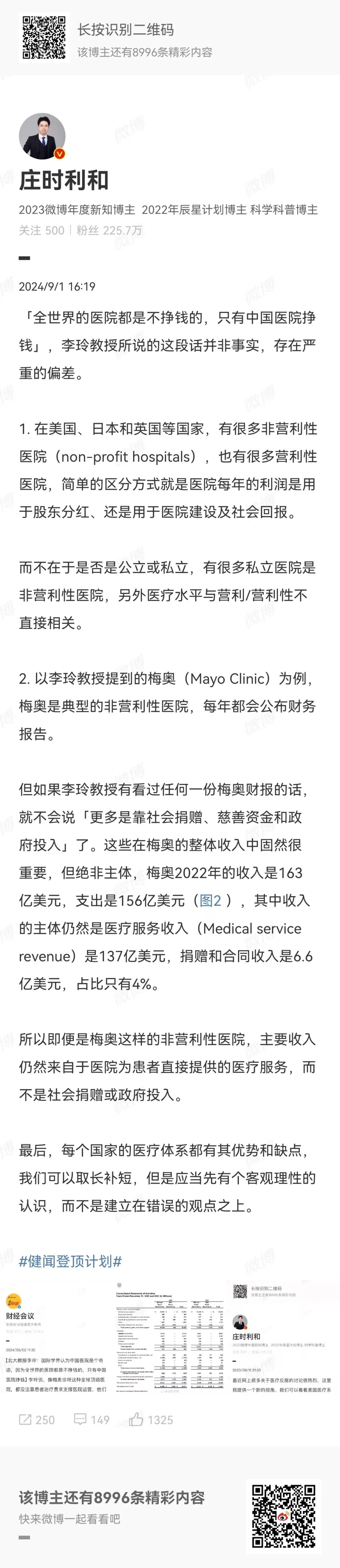 李玲喊着免費醫療的口號,用“完全不是事實“的許多證據來論證她的主張。比如,她説什麼“全世界的醫院都是不掙錢的,只有中國醫院掙錢”,這就純純胡説八道。這點@莊時利和 老師用梅奧(Mayo Clinic)為例 説明了李玲在胡説八道。
