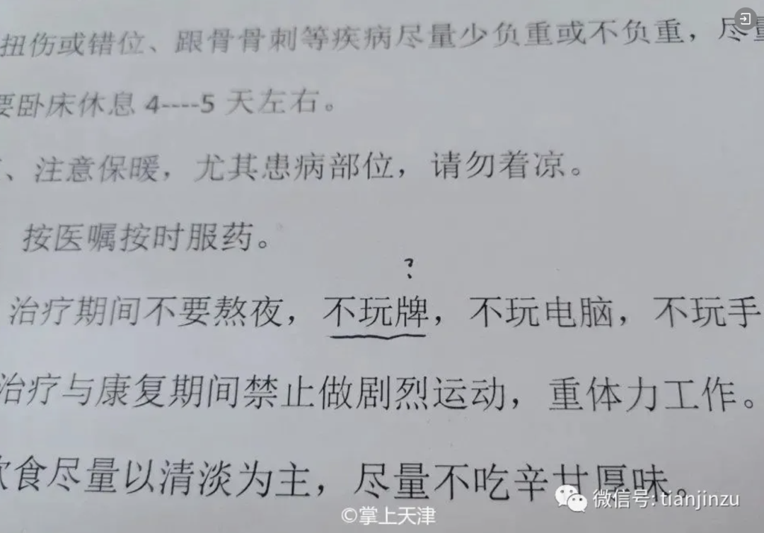 天津醫院給的醫囑,要特地加上“不玩牌”,可見天津大爺有多不省心。大爺心想:光寫不玩牌也沒讓不下棋啊。