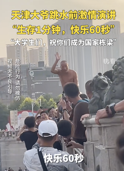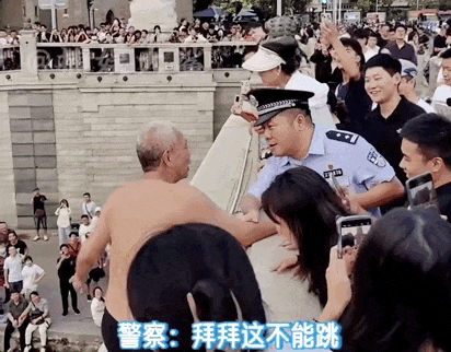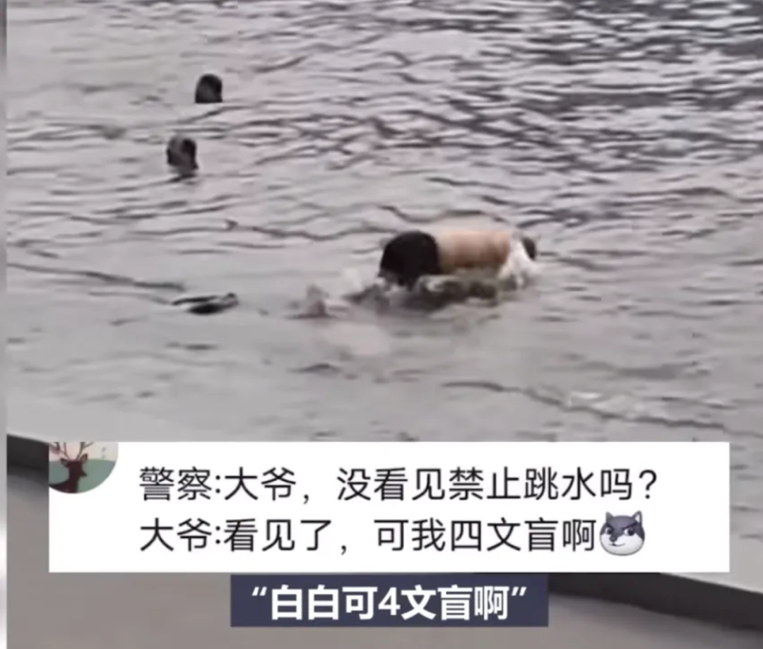 為了安全起見,河邊其實到處都擺着“嚴禁跳水”的標語,但警察也攔不住,拉着大爺勸:“這兒不讓跳!”大爺表示:“我不ins字兒,孩子們還等着呢!”