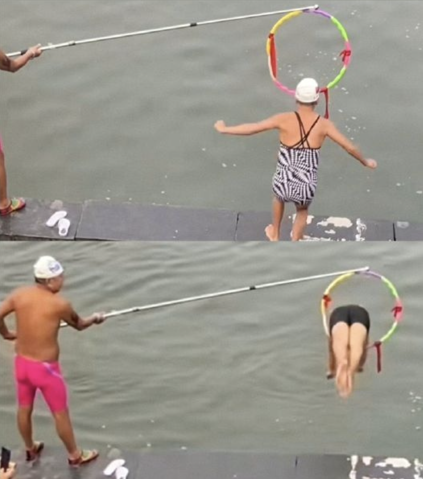 光跳水項目不過癮,還升級了團體花樣游泳、高難度水上跳圈兒……果真天津人可以不活,不能沒活。