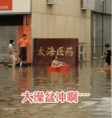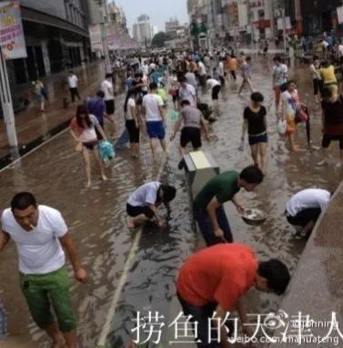 有一年天津暴雨,街都被水淹了,於是天津人決定在路上劃皮划艇、衝浪、撈魚、洗澡,從遊樂園搞來滾筒球玩得不亦樂乎。