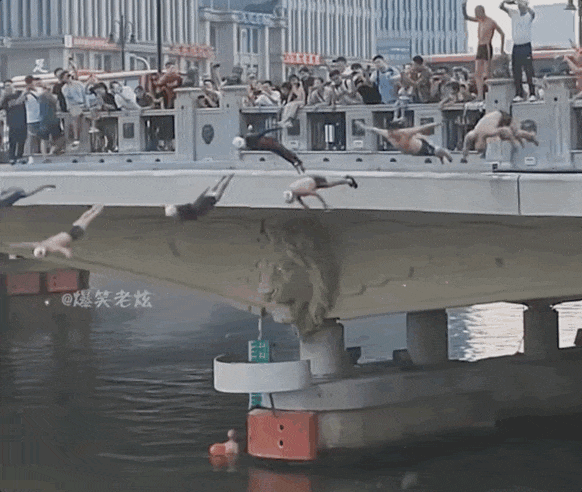 一波天津大爺在公園當武林高手,另一波則在海河獅子林橋上跳水呢,正所謂“北京陰河北雨,天津局部下大爺”。
