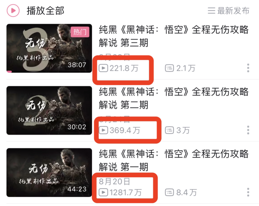 B站UP主“-純黑-”遊戲通關後,立刻來了個純享版攻略,他推出的《程無傷攻略解説》剔除了打鬥部分的劇情解説,第一期播放量高達1281萬,是B站播放量第一,之後的二三期也是百萬級播放。