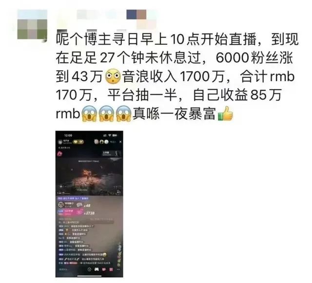 在連續直播32小時後,有網友爆料,他光音浪就收入1700萬,去掉平台抽成,再加上各種禮物打賞,最後進賬85萬。