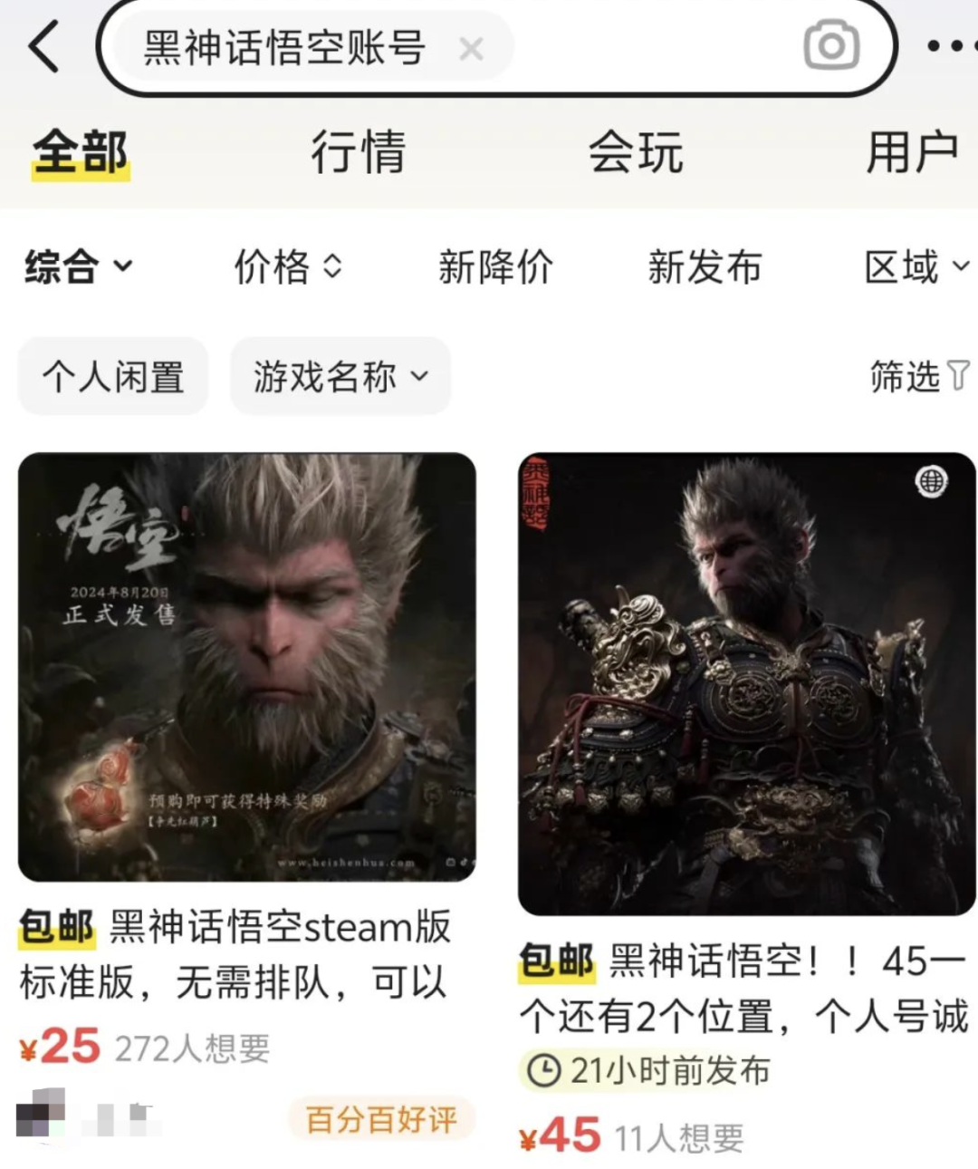 在二手市場上租號也發展成了一門生意,某平台還上線了“黑神話悟空租號”的專區。