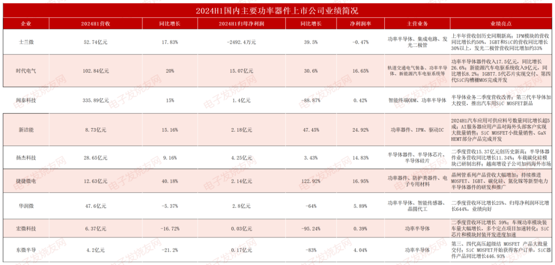 今年截至8月30日,我們統計了部分已經公佈2024H1業績的功率半導體上市公司,包括士蘭微、時代電氣、新潔能、揚傑科技、聞泰科技、捷捷微電、華潤微、宏微科技、東微半導等功率半導體廠商的業績情況,看今年功率半導體市場走勢如何。