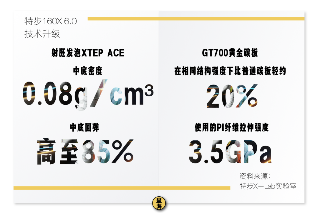 **特步的發佈會給到了我們答案。特步新一代冠軍版跑鞋160X系列給出了新的可能,**首次在碳纖維材料中加入航天級超級纖維(PI纖維),突破傳統碳板物性極限,首創GT700超級碳板,宣告了中國跑鞋黃金時代的到來,世界跑鞋,中國特步。
