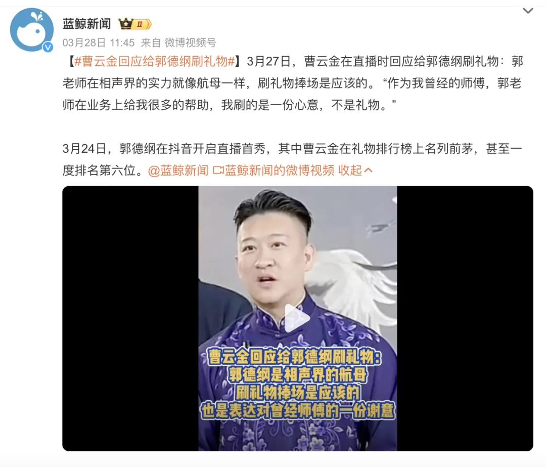2024年3月24日,郭德綱在某平台直播間,在線觀眾瞬間超過十萬。曹雲金也獻上了“大火箭”成為他的“榜六大哥”。