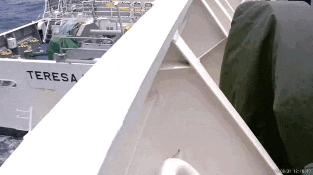比如在一段長度為21秒的視頻裏,可以看到中國海警5205號艦位於菲9701號艦的右舷艦艉方向,“推”着菲律賓海警船前進,可以想見之前雙方的態勢,應當是中國海警船位於菲律賓海警船的右舷,菲海警船從中國海警船艦艏直接橫插通過,才形成了中國海警船頂着菲律賓海警船前進的態勢;
