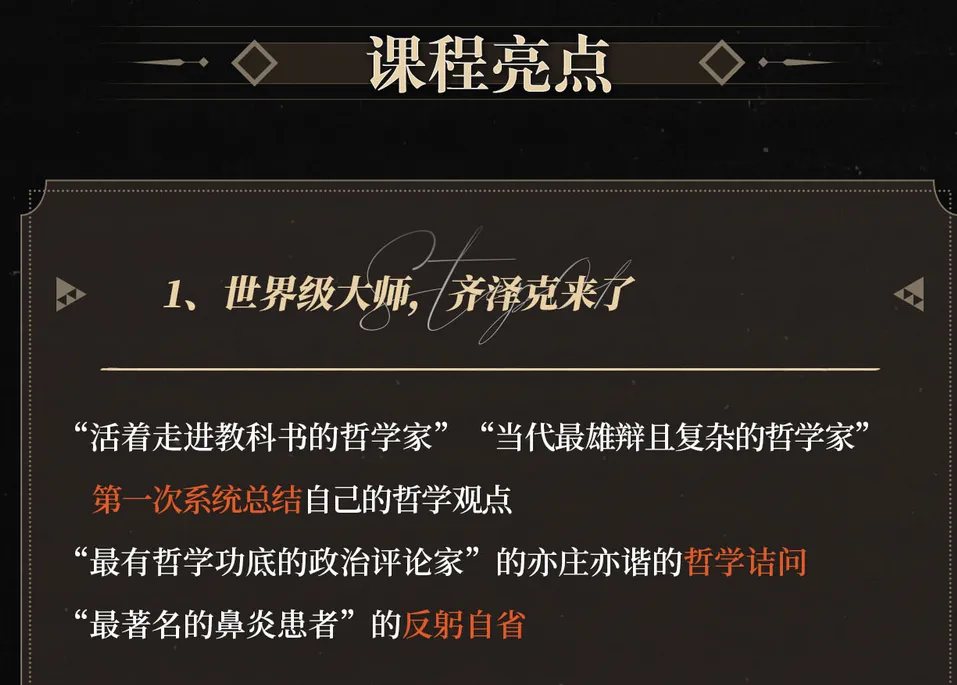 還是再疊一層甲,我們不是在批評人家搞左翼哲學付費這個事本身。看學院派方面的動態,大概不認為自己這個課屬於時下的“知識付費”概念,我們沒看過這個課的具體內容,如果做的好那就是物有所值。只不過,且不説被人盯着不放的打着齊澤克名號的180元課程,老齊本人出鏡不到10分鐘這個事,僅從海報宣傳上看,還是有那麼一些文化消費主義的元素。
