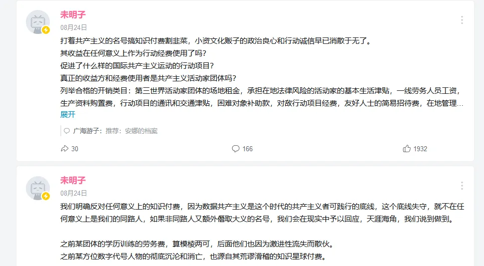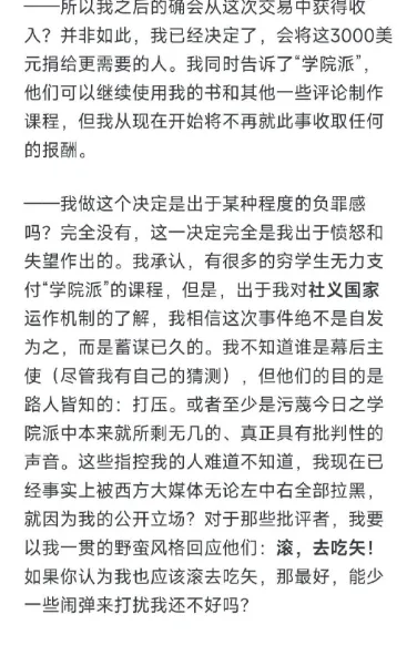 像齊澤克這種咖位,只靠教職和講座就能過的很好,但放眼全球,大多數普通左翼知識分子確實做不到這樣。而且雖然左翼知識分子們普遍反對消費主義,但也要請客吃飯過日子,搞搞知識付費也無可厚非。但問題在於,我國的賽博左翼特別無限可分,所以帶貨也好知識付費也好就總會成為批判異端左翼時的標靶。