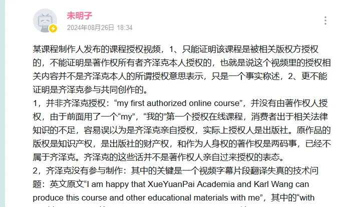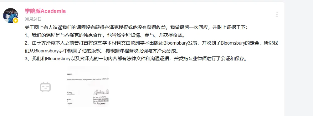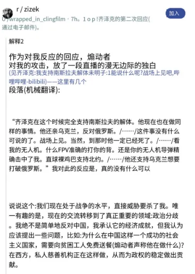 本來這事就已經挺有意思了,結果這兩天更有意思的事來了。在雙方爭論愈演愈烈之後,有多人詢問了齊澤克,得到的回答是確實有部分授權,然後齊澤克先生在回覆裏邊進行了一串非常沒有水平的抱怨,指責這件事情是中國針對他的陰謀,他已經被西方國家的媒體針對了很久之類的怪話。