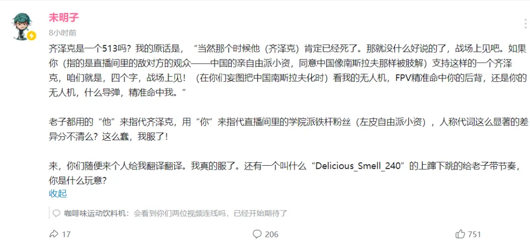 本文快收尾時該事件又出現了後續,事件中未明子一方從與學院派對線發展到與齊澤克直接對線,老未翻出齊澤克當年在南斯拉夫解體過程中參與自由派活動的舊賬。老齊沒直球接招,而是像前面一樣又試圖把矛盾引向中國,認為未明子之前搞的免費送餐公益活動是因為中國工人吃不飽飯(潛台詞就和他前面的聲明一樣,説“中國不是社會主義國家”)。