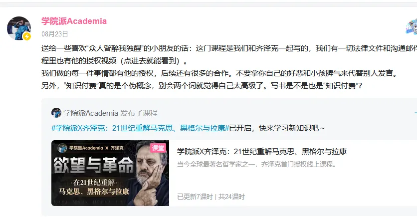 這幾天B站哲學區相當熱鬧。知名哲學UP學院派推出了號稱“齊澤克首門授權”的獨家線上課程,12課時共180元。然後這事被哲學區以未明子為代表的另一些UP質疑,指責課程中齊澤克出鏡時間只有不足十分鐘,同時懷疑齊澤克是否得到了報酬,並且認為考慮到齊澤克對知識產權的批判,支持盜版的立場,賣課這件事情並不合適。學院派方面也對質疑者進行了回擊。