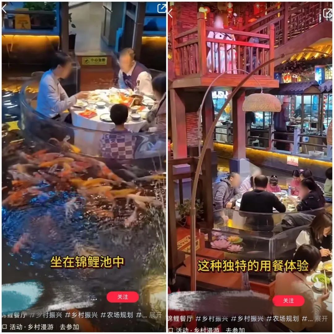 國內也有一些餐廳絞盡腦汁增加餐廳的場景互動性和趣味性,比如河北保定的一家“錦鯉餐廳”,用餐區就位於錦鯉池中,顧客吃飯時,身旁環繞着游來游去的錦鯉,可以一邊吃飯一邊賞魚、餵魚。