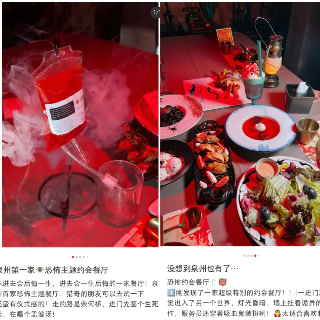 在福建泉州,有一家恐怖主題餐廳主打密室逃脱+西餐。社交平台上不少年輕情侶前去打卡。
