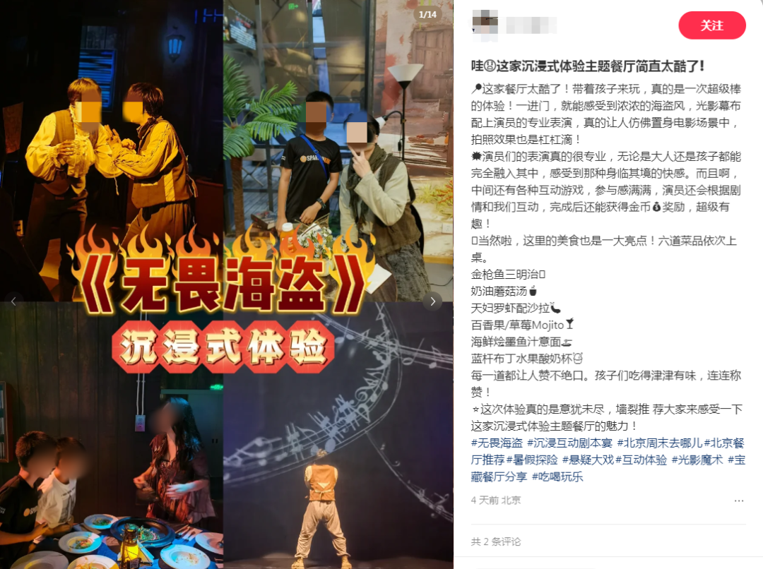 在北京,有一家“無畏海盜”主題“餐廳”把沉浸式戲劇表演和餐飲結合在一起,推出了奇幻海盜互動劇本宴,在社交平台頗受歡迎。