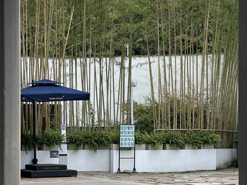 遊戲科學在杭州西湖區象山藝術公社的辦公室,就處在這樣的平靜之中。這棟不起眼的三層白色小樓被一圈3米高的竹子所包圍,似乎在有意地劃出一道分界線,想要將一切紛擾擋在外面。門口,遊戲科學通過一張立牌向想要前來“朝拜”的玩家喊話:設計繁忙、研發緊張,非請勿入,請多見諒。