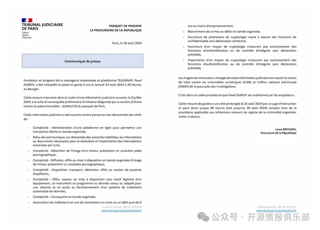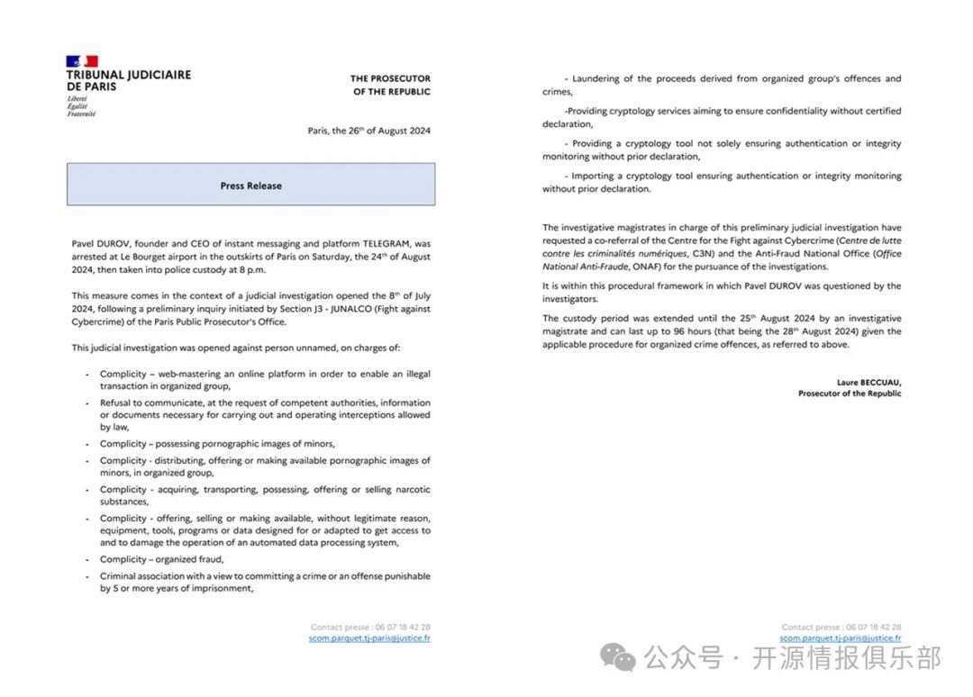 根據法國巴黎檢方在26日發佈的聲明,對帕維爾·杜羅夫的具體12項指控罪名如下:
