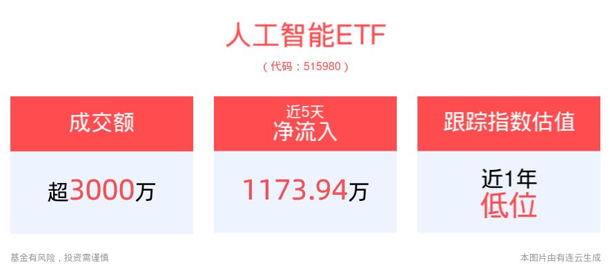 資金流入方面,人工智能ETF近5個交易日內有3日資金淨流入,合計“吸金”1173.94萬元,日均淨流入達234.79萬元。