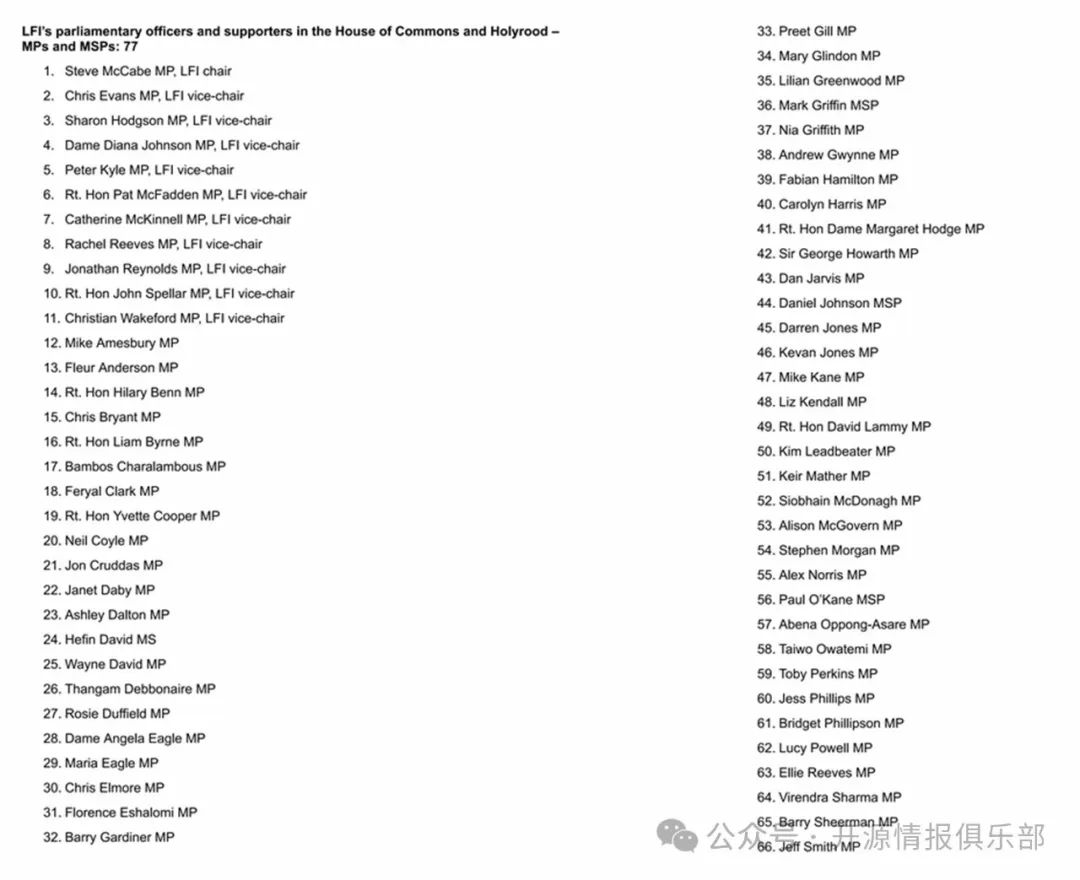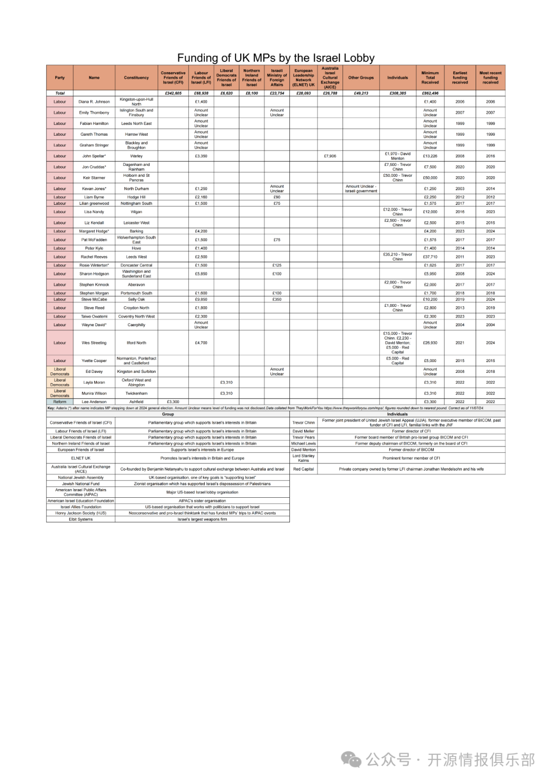 工黨議員的其他捐助者包括英國以色列通信和研究中心(BICOM)前主任大衞·芒頓(David Menton)和LFI前主席喬納森·門德爾松(Jonathan Mendelsohn)擁有的私營公司 Red Capital。