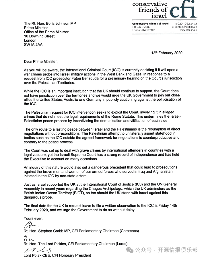 在2020年,以色列保守派之友(CFI)敦促英國政府直接反對國際刑事法院(ICC)對以色列在巴勒斯坦被佔領土犯下的戰爭罪行的決定展開調查,CFI高級官員在寫給首相鮑里斯·約翰遜(Boris Johnson)和英國外交大臣多米尼克·拉布(Dominic Raab)的信中認為:“作為非國家行為者,巴勒斯坦人不符合《羅馬規約》的法律要求”。CFI並聲稱此舉“適得其反,與和平進程背道而馳”,並且“以色列和巴勒斯坦之間實現持久和平的唯一途徑是恢復無先決條件的直接談判”。以下是CFI寫的信件原文。