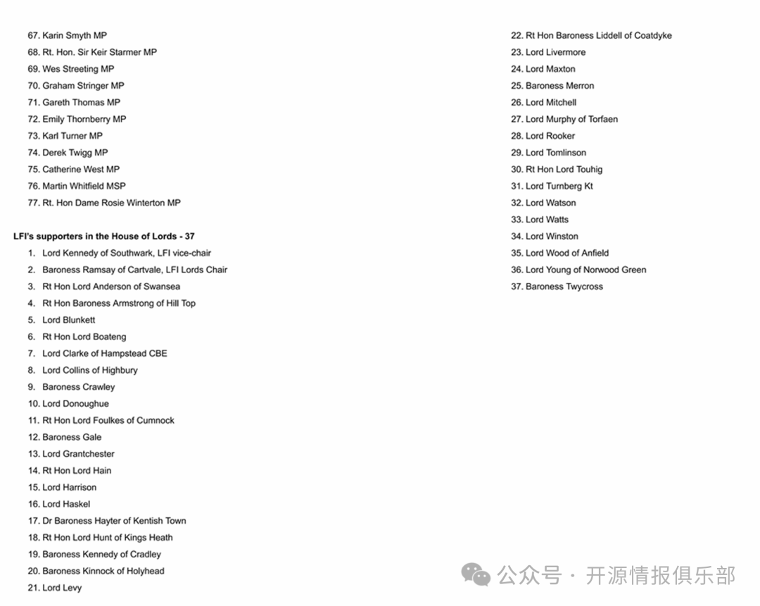 該組織最近從其網站上刪除了其議會支持者的名單,恢復的名單如下: