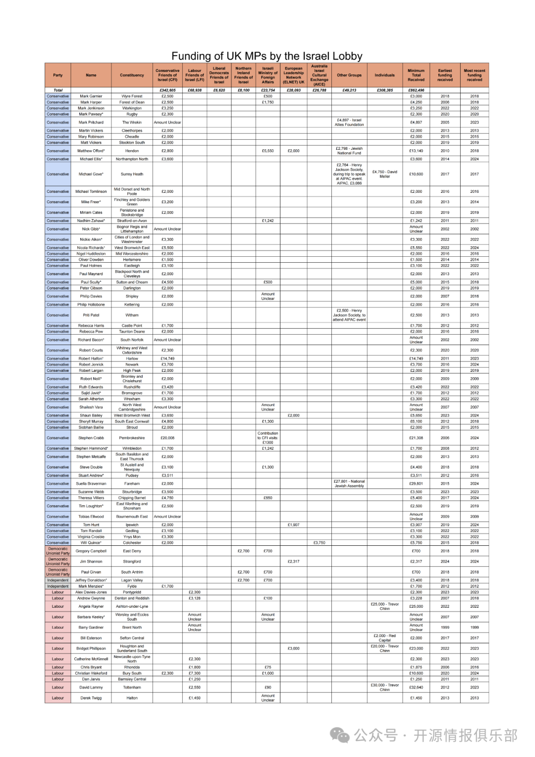 其中包括130名保守黨議員、41名工黨議員和3名自由民主黨議員,3名民主統一黨成員、2名無黨派人士和改革黨的唯一一名議員組成了這一名單。其中親以色列團體、個人和以色列國家機構的捐款總額超過100萬英鎊。在他們之間,這些政客們花了240多次前往以色列,總花費超過五十萬英鎊。
