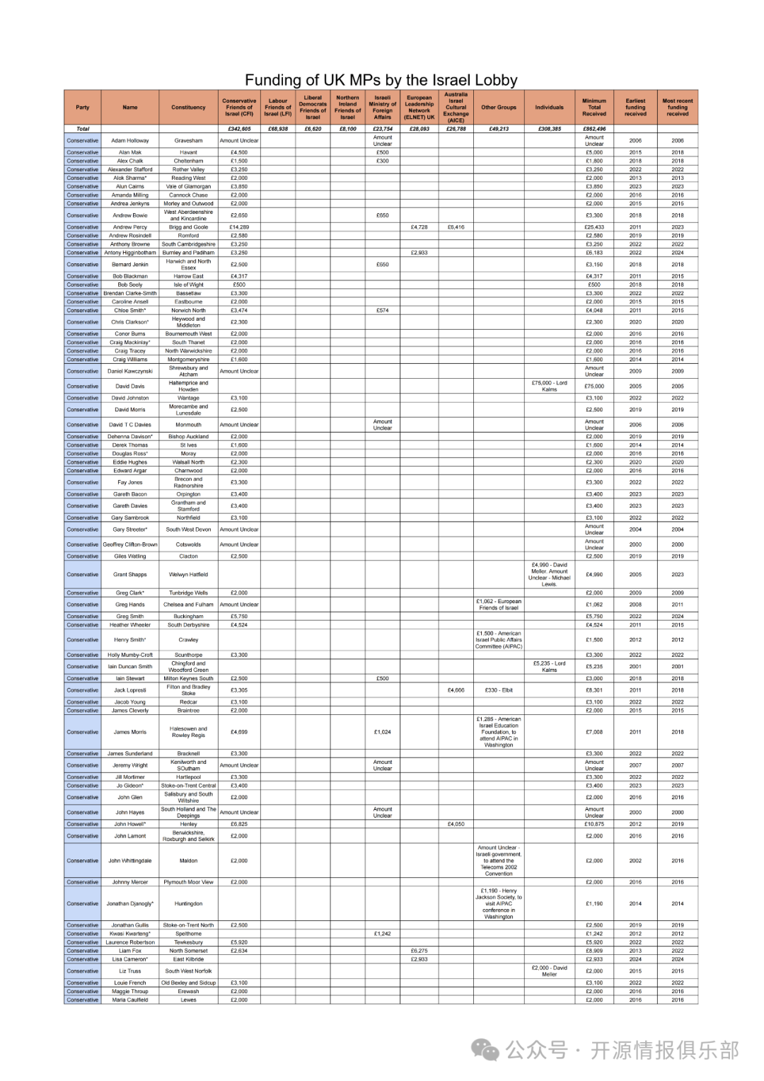 其他保守黨議員也接受了以色列歐洲之友(European Friends of Israel)和以色列盟友基金會(Israel Allies Foundation)的資助。