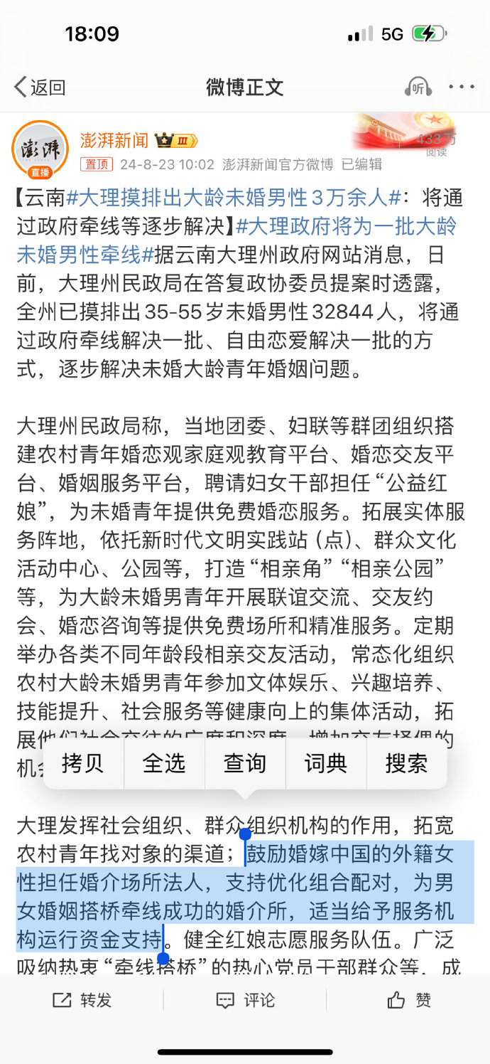 “鼓勵婚嫁中國的外籍女性擔任婚介場所法人,支持優化組合配對,為男女婚姻搭橋牽線成功的婚介所,適當給予服務機構運行資金支持。”