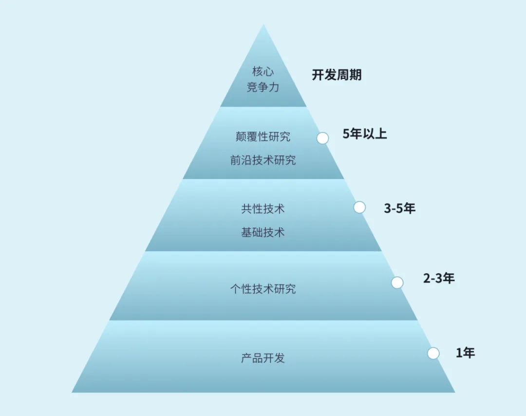 這是個結合了技術開發週期以及美的業務屬性而設定的研發體系。它尊重技術研發的客觀規律,根據技術的重要程度、開發難度來分級定類,不管是單個產品的微型創新,還是國家層面的重大戰略性技術,都可以在這個體系下穩妥落地,研發週期從1到5年以上不等,確保了前沿技術不會因商業上的急於求成而半途而廢。