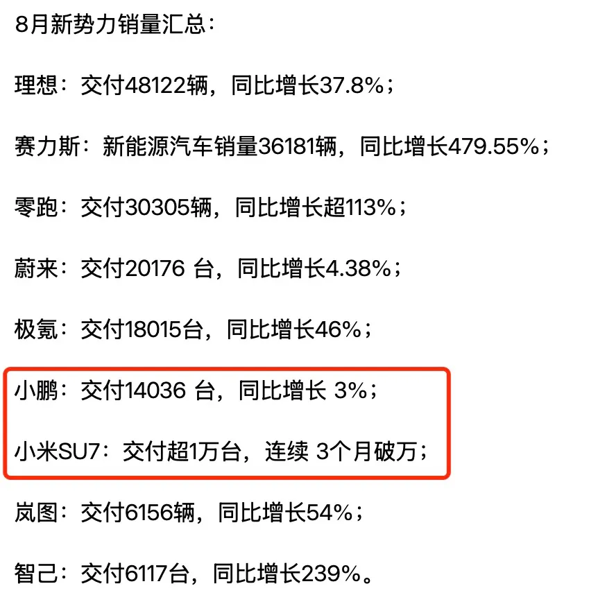 反觀下,小鵬汽車雖然是新能源市場的第一批入局者,且在轎車、SUV和MPV三大細分領域均有佈局,但銷量表現卻持續下滑。如今,其旗下所有車型加在一起的月銷總和,僅能與像小米SU7這樣爆款車型的月銷對壘。