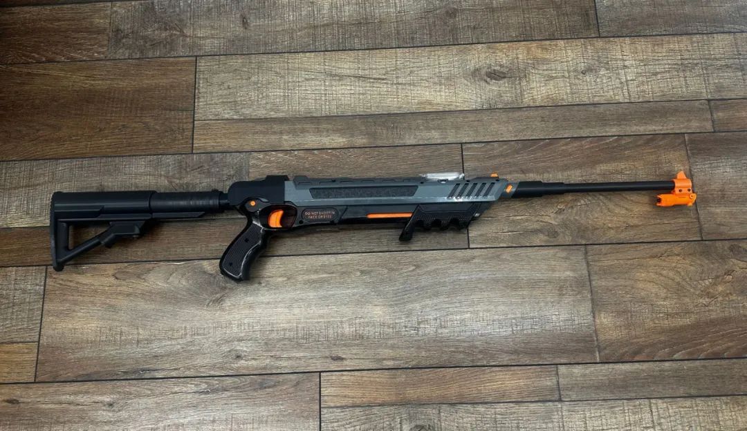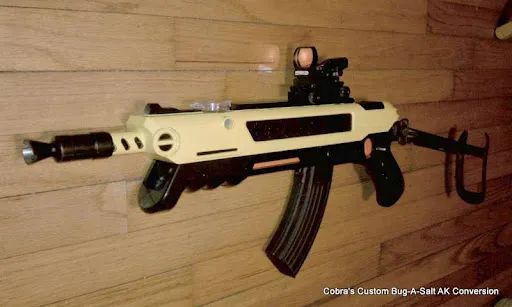 這是一種發射鹽粒的玩具,沒錯就是炒菜時放的食鹽,然後像霰彈槍一樣手拉上膛,使用壓縮空氣原理,扣動扳機會噴出去一片鹽粒,類似霰彈槍使用的鳥彈,覆蓋範圍較廣,並且不會在房間裏留下明顯的子彈垃圾殘留物。