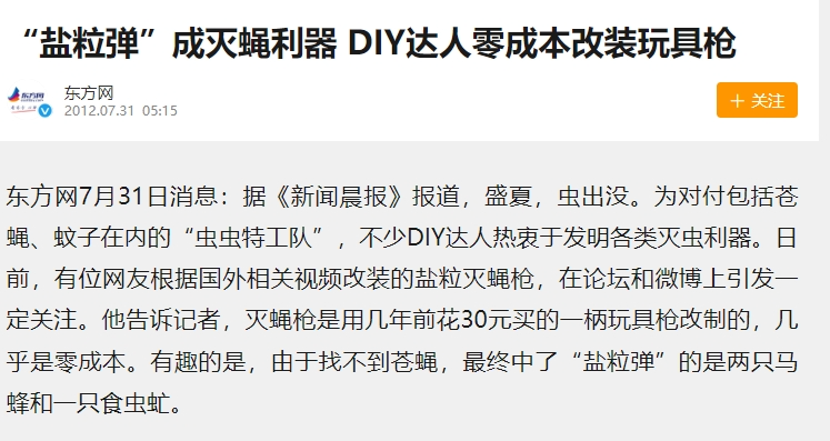 ▲2012年7月,國內媒體曾報道一名大學生參考國外視頻,用手拉玩具槍添加鹽粒改裝出滅蠅槍,其實就是參照馬焦雷的視頻。