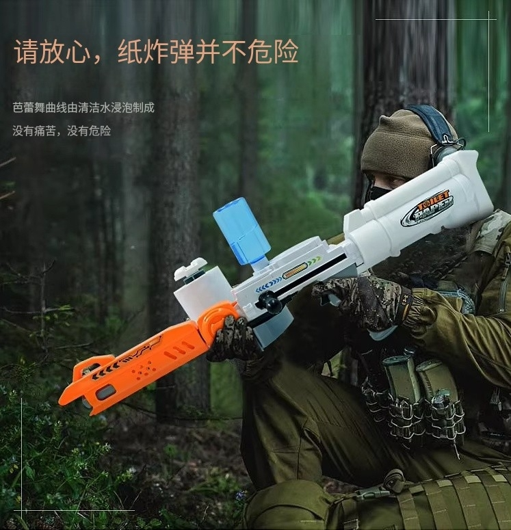 此時扣動扳機,壓縮氣體會將濕潤的衞生紙從槍膛裏噴出,如同一口濃痰一樣拍在目標上,非常噁心,不過威力絕對安全