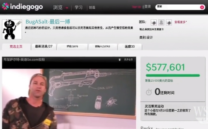 鹽槍A三個月時間居然籌集到57.7萬美元,收穫2萬多個訂單,連《華爾街日報》都進行了報道。嚇的他不得不臨時下架停止接單,之後他在藝術工作室裏成立了Bug A Salt公司,正式開始銷售這款鹽槍。